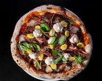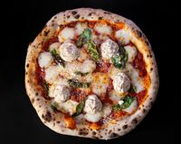 خمیر ناپولیتن و پولد بیف و سس کلاسیک برگر و سالسا گوجه و بیکن و پیاز قرمز و ریحان ایبتالیایی