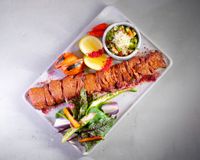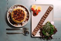 شیشلیک گوسفندی مزه دار شده با چاشنی های ترکیه ای (به همراه سالاد شیرازی ، میکس سبزیجات مدرن ، فلفل کبابی ، گوجه ، هویج بنفش بلانچ شده ، لیمو و کته با ته دیگ سیب زمینی )