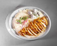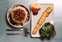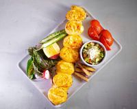 فیله مرغ مزه دار شده با چاشنی مخصوص و زعفرون (به همراه سالاد شیرازی ، میکس سبزیجات مدرن ، فلفل کبابی ، گوجه ، هویج بنفش بلانچ شده ، لیمو و کته با ته دیگ سیب زمینی)