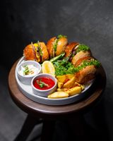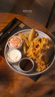 فیله و سالادکلم و سس چیلی تای و سس قرمز و سیب زمینی وج