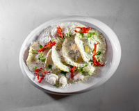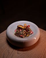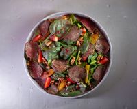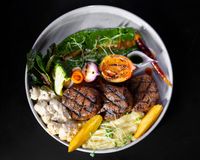 فیله گوساله مزه دار شده با فیلینگ گردو و قارچ و سبزیجات معطر (به همراه سالاد شیرازی ، میکس سبزیجات مدرن ، فلفل کبابی ، گوجه ، هویج بنفش بلانچ شده ، لیمو و کته با ته دیگ سیب زمینی)