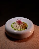 350 گرم سیبنه مرغ مزه دار شده با فیلینگ کره مزه دار شده و سس مارسلا و مش پوتیتو و دورچین سبزیجات