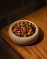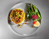 میگو طبخ شده با پیاز فراوان در چاشنی های جنوبی همراه با کته