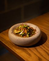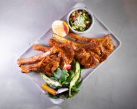 راسته گوسفندی مزه دار شده (به همراه سالاد شیرازی ، میکس سبزیجات مدرن ، فلفل کبابی ، گوجه ، هویج بنفش بلانچ شده ، لیمو و کته با ته دیگ سیب زمینی)