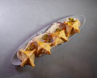 میکس گوشت چرخ شده مزه دار شده پیچیده در خمیر سیب زمینی همراه با دیپ ماست و پیازچه