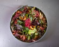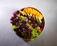 بی بی اسفناج و اسلایس فیله گوساله مزه دار شده گریل و پرتقال و توت فرنگی و گردو و درسینگ انار و بالزامیک و سیزنینگ سالاد و پنیر پارمسان