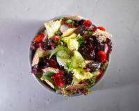 کاهوپیچ و کاهو فرانسه و خیاراس لایس و گوجه گیلاسی و ترپچه اسلایس و انار و نان اغشته با مغزیجات و سیزنینگ سالاد