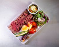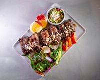 دنده گوسفندی و راسته گوسفندی مزه دار شده با چاشنی ترکیه ای (به همراه سالاد شیرازی ، میکس سبزیجات مدرن ، فلفل کبابی ، گوجه ، هویج بنفش بلانچ شده ، لیمو و کته با ته دیگ سیب زمینی)