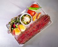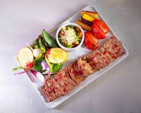 شیشلیک گوسفندی مزه دار شده با چاشنی های ترکیه ای (به همراه سالاد شیرازی ، میکس سبزیجات مدرن ، فلفل کبابی ، گوجه ، هویج بنفش بلانچ شده ، لیمو و نان پیتا مخصوص بولرو )