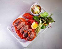 راسته گوسفندی مزه دار شده با چاشنی ترکیه ای (به همراه سالاد شیرازی ، میکس سبزیجات مدرن ، فلفل کبابی ، گوجه ، هویج بنفش بلانچ شده ، لیمو و کته با ته دیگ سیب زمینی)