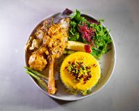 گردن گوسفندی دوپیازه طبخ شده در روغن به همراه باقالی پلو