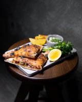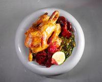 جوجه کامل 800 گرمی مزه دار شده با چاشنی تندوری (به همراه سالاد شیرازی ، میکس سبزیجات مدرن ، فلفل کبابی ، گوجه ، هویج بنفش بلانچ شده ، لیمو و نان پیتا مخصوص بولرو)