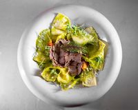 پاستا راویولی بافیلینگ گوشت خورد شده با سس چهارپنیر و سس اسپیناچ و قارچ و پاپریکا کنفی شده