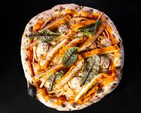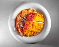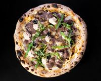 سس سیر فیله گوساله ورقه ای مزه دار شده و پنیر پیتزا و سبزیجات مدرن و سیزنینگ پیتزا و روغن اروماتیک