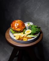 خمیر ناپولیتن و سس پستو و سس کلاسیک برگر و سینه مرغ کریسپی و چیپس بادمجان و کلم سفید و پیاز قرمز ژولین