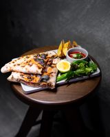 زیتون گریل ، نان کریسپی ، فلفل دلممه ای ، خیار ، گوجه ، پنیر لبنه ، سس مخصوص چوپان ، بیبی اسفناج
