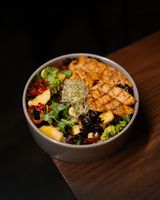 فیله مرغ مزه دار شده گریل کاهوی روماین(فرانسوی ۲ رنگ) بیبی اسفناج روکولا گوجه خشک بادام هندی پنیر پارمزان میکروگرین آناناس همراه با سس مخصوص بولرو