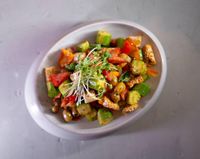 سیب زمینی گردویی تنوری شده اغشته با سس بنگ بنگ و فلفل دلمه ای و ژامبون مرغ و قارچ